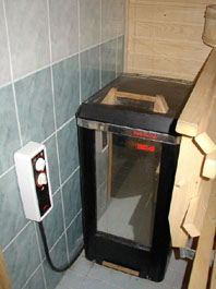 Kuvaa saunasta (valaisin lauteiden alla) ja hetivalmis kiuas .